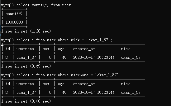 这里通过程序给表插入了一千万的数据,对比查索引字段和普通字段的区别