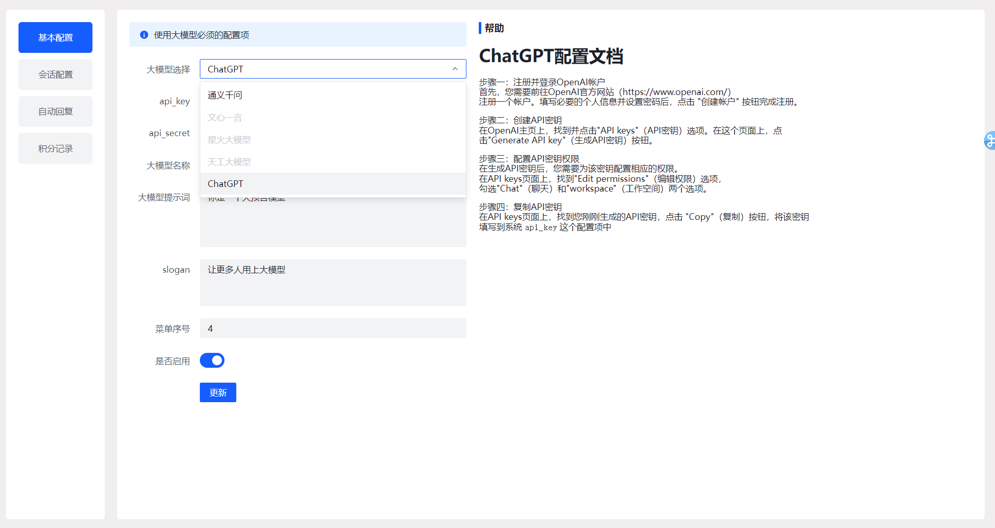 还实现了多语言模型的配置,支持国内的各大语言模型以及国外的chatGPT