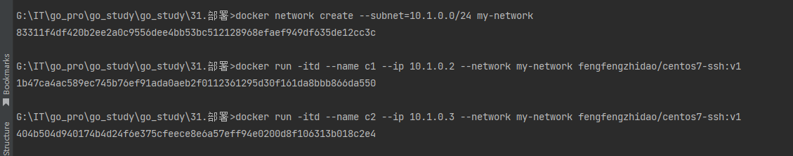 docker run -itd --name c2 --ip 10.1.0.2 --network my-network fengfengzhidao/centos7-ssh:v1