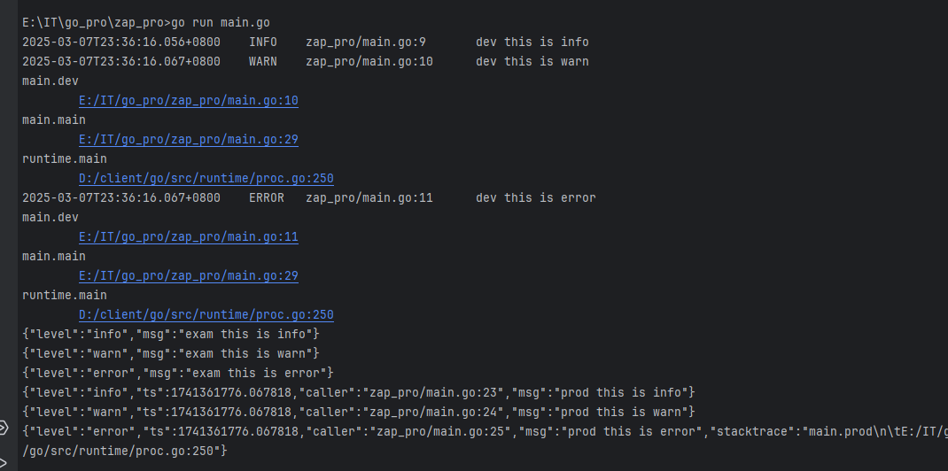 prod模式下,格式也是json,多一个时间和函数位置字段,生产环境上用json格式的日志更方便排查