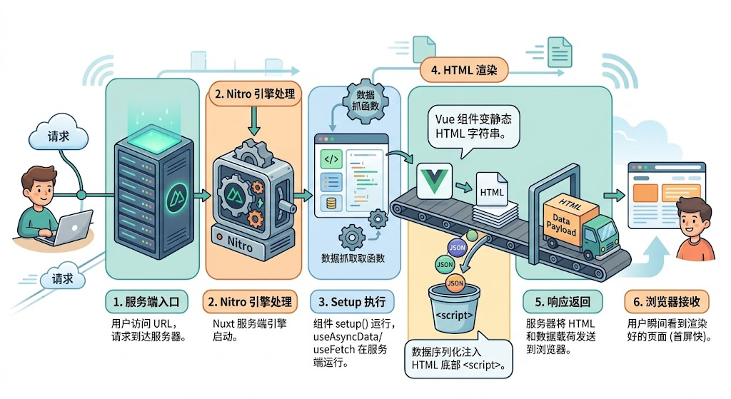 - 过程: 请求发送到 Node.js 服务器,Nuxt 执行所有初始化和数据获取钩子,生成 HTML 返回。