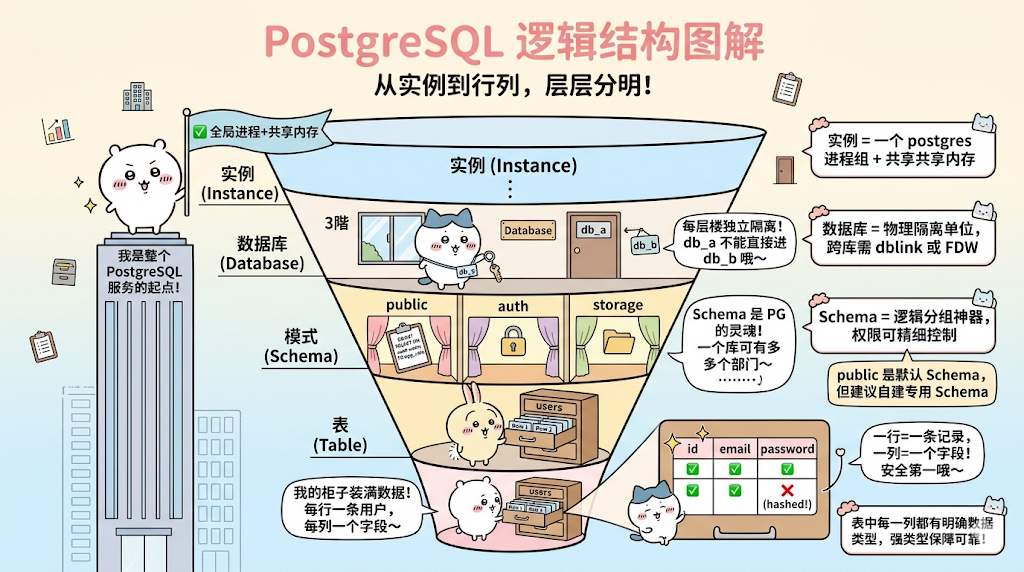PostgreSQL 的逻辑结构从大到小依次为:实例 (Instance) > 数据库 (Database) > 模式 (Schema) > 表 (Table) > 行与列 (Row & Column)